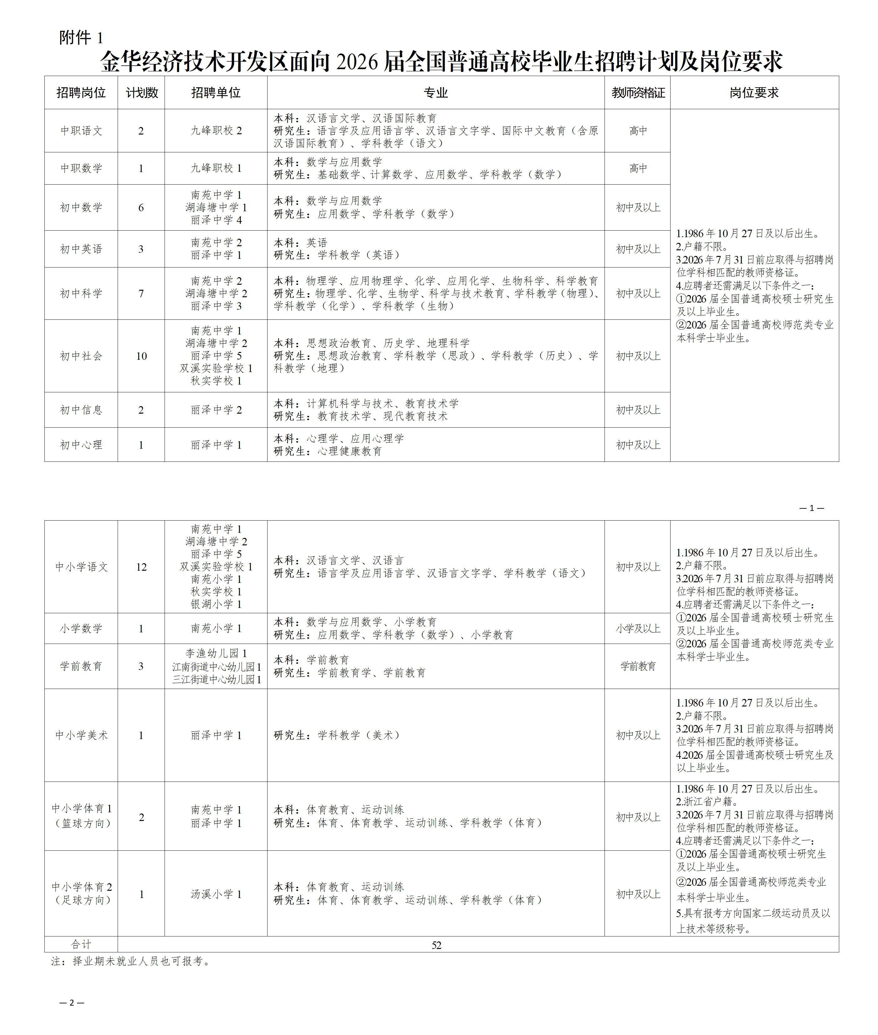 金華經濟技術開發區部分公辦學校(幼兒園)麵向2026屆全國普通高校畢業生公開招聘教師公告